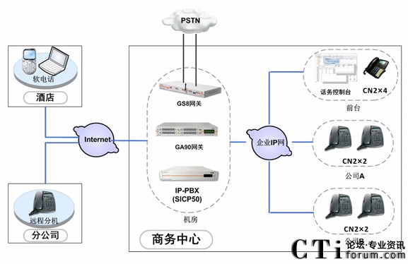 中天凱旋利用企業(yè)內(nèi)部完善的IP通信網(wǎng)絡(luò),在機房部署SICP系統(tǒng),負責(zé)整個語音通信系統(tǒng)的服務(wù)管理、用戶管理。部署GA90網(wǎng)關(guān)和GS8網(wǎng)關(guān),分別使用E1中繼線路和普通模擬線路接入PSTN網(wǎng)絡(luò),保證系統(tǒng)的通信。