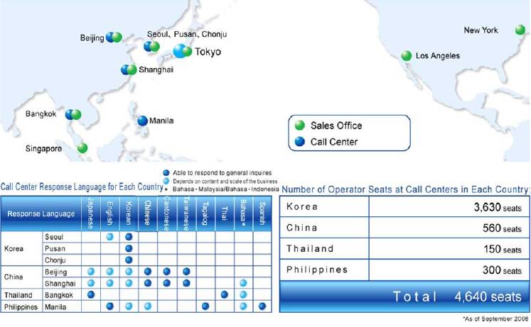 transcosmos于1989年在美國建立了海外分部并于2001年開始進(jìn)軍亞洲的海外市場提供呼叫中心和數(shù)碼營銷服務(wù)。Transcosmos在呼叫中心服務(wù)上共投資450,000,000日元而且在6個(gè)國家的10所城市發(fā)展了本地的呼叫中心服務(wù)。同時(shí),transcosmos為了滿足客戶促進(jìn)業(yè)務(wù)發(fā)展的需求,在亞洲各國戰(zhàn)略性地設(shè)置了執(zhí)行官以及總監(jiān)級別的管理層,也建立了可以提供10種主要亞洲語言的構(gòu)架。通過transcosmos多樣分部的統(tǒng)一管理,提高了服務(wù)質(zhì)量并且在不斷累積的業(yè)務(wù)訣竅和知識上達(dá)到業(yè)務(wù)效能。