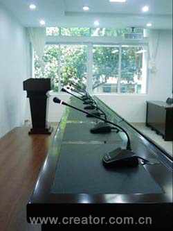 所以在本會議室配置了1臺標準的會議討論型控制主機臺CR-M4101,1臺座式的主席機CR-M4102B,9臺座式的會議代表機CR-M4104B,另外還有連接電纜等。主席機具優(yōu)先控制權(quán),設置主席位置,并且可以移動,代表機分別設置其余數(shù)個話筒點。采用手拉手方式,一條總線即可連接所有會議討論設備,布線簡單快捷。通過專業(yè)的音頻輸出口和音響擴聲系統(tǒng)結(jié)合,清晰、明亮的將發(fā)言人的聲音重放出來。