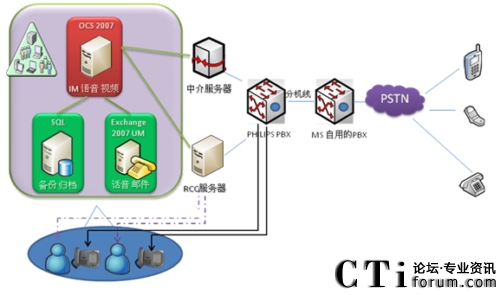 Office Communications Server 使用SIP 協(xié)議連接到PHILIPS Is3030交換機(jī)。然后通過(guò)微軟演示中的PBX再連接到本地的PSTN.