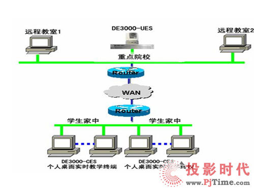 如上圖所示:DE3000系列中的DE3000-CES(個人桌面實時教學終端)主要用于學生在家里的PC上與學校的老師進行實時的面對面授課。在學校的多媒體教室配備DE3000-UES(遠程教育終端設備),在學生家中的電腦上安裝DE3000-CES(個人桌面實時教學終端),即可實現(xiàn)遠程實時授課,其高質量的音視頻效果與強大的數(shù)據(jù)功能,使學生猶如坐在教室里上課一樣,可體現(xiàn)出強烈現(xiàn)場感。