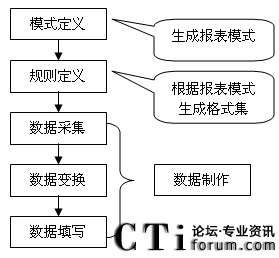 數(shù)據(jù)制作是報表生成過程的最后一個步驟,它在模式定義的基礎上,使用規(guī)則定義生成的映射規(guī)則集合將業(yè)務數(shù)據(jù)映射到報表中。根據(jù)數(shù)據(jù)規(guī)則的內容,數(shù)據(jù)制作過程具體可以分為三個步驟,數(shù)據(jù)采集,數(shù)據(jù)變換,數(shù)據(jù)填寫。