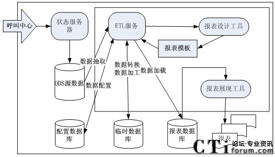 以上架構圖中的呼叫中心是指呼叫中心系統(tǒng)的基礎話務功能部件,它是整個報表系統(tǒng)的基礎,為其提供最初的數(shù)據(jù)來源,包括其基礎部件的通訊等。