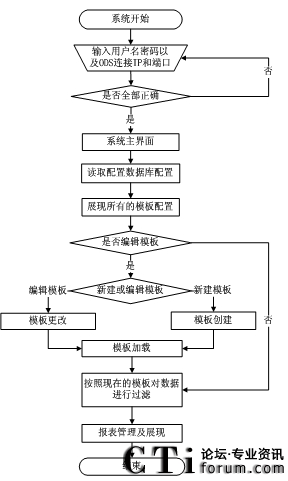 根據(jù)流程圖,使用者在進入系統(tǒng)時需要輸入用戶名和密碼以及要連接的ODS數(shù)據(jù)源的IP和端口。如果信息正確,則進入到報表系統(tǒng)主界面。然后報表設計工具會從配置數(shù)據(jù)庫中讀取報表模板配置,再將現(xiàn)在統(tǒng)計數(shù)據(jù)的報表模板信息展現(xiàn)出來。