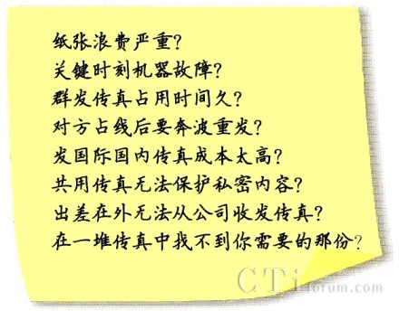 對于大多數企業(yè)而言,傳真有其不可替代的地位:銷售、采購、訂單、合同,這些企業(yè)的生命線都離不開傳真。使用傳統(tǒng)的傳真機,您遇到過下列情況嗎?