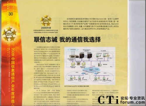CTI論壇(ctiforum)11月24日消息(記者 張塵):日前,在中國(guó)計(jì)算機(jī)報(bào)社開(kāi)展了2009年度中國(guó)信息通信產(chǎn)業(yè)年度獎(jiǎng)項(xiàng)評(píng)選活動(dòng),北京聯(lián)信志誠(chéng)信息技術(shù)有限公司(簡(jiǎn)稱(chēng)“MyComm公司”)憑借領(lǐng)先的IP語(yǔ)音通信技術(shù)優(yōu)勢(shì),以其長(zhǎng)久以來(lái)業(yè)界口碑和今年所取得優(yōu)秀業(yè)績(jī),榮獲2009年度中國(guó)信息通信呼叫中心領(lǐng)域領(lǐng)軍企業(yè)獎(jiǎng)和2009年度中國(guó)信息通信IP呼叫中心優(yōu)秀創(chuàng)新產(chǎn)品獎(jiǎng)。