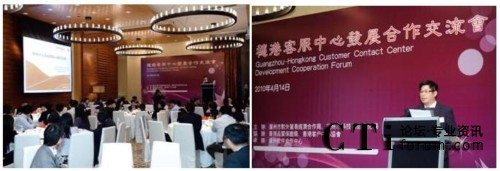 CTI論壇(ctiforum)5月12日消息(記者 潘婷婷):為促進(jìn)穗港兩地企業(yè)交流與合作,共同提升兩地客戶服務(wù)中心的服務(wù)品質(zhì),2010年4月14日(星期三)11:00-13:30,由廣州市對外貿(mào)易經(jīng)濟(jì)合作局、廣州市科技和信息化主辦,廣州軟件合作中心承辦的“穗港客服中心發(fā)展合作交流會”在香港凱悅酒店順利舉行。
