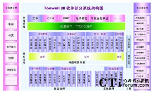 - Toowell DM 具備強(qiáng)大的業(yè)務(wù)整合能力,軟件框架基于呼叫中心全方位解決方案,支持訂單、投訴、業(yè)務(wù)開通、知識管理等。