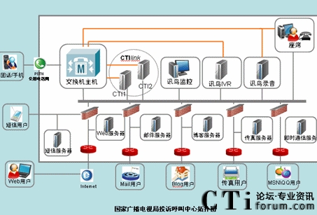 系統(tǒng)主要包含IVR服務(wù)器,CTI服務(wù)器,短信網(wǎng)關(guān),郵件服務(wù)器,傳真服務(wù)器,數(shù)據(jù)庫服務(wù)器,座席系統(tǒng)等。客戶撥打特服號(hào)碼接入廣電公司客服系統(tǒng),首先由IVR提供自動(dòng)語音服務(wù)。CTI服務(wù)器負(fù)責(zé)所有的電話的路由、排隊(duì)、轉(zhuǎn)接和控制?蛻粼诮邮茏詣(dòng)語音服務(wù)時(shí),如果需要人工幫助,可選擇轉(zhuǎn)入人工座席。由IVR系統(tǒng)向CTI發(fā)出轉(zhuǎn)接請(qǐng)求,完成轉(zhuǎn)接功能。