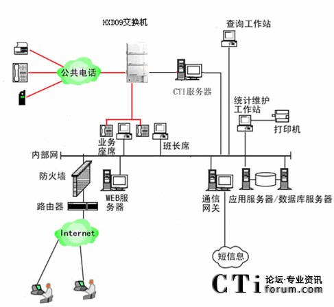 本系統(tǒng)物理結(jié)構(gòu)HXD交換機(jī)、CTI服務(wù)器、IVR(交互式語音應(yīng)答)/IFR(交互式傳真應(yīng)答)服務(wù)器、業(yè)務(wù)代表座席(邏輯上分為:普通業(yè)務(wù)代表座席、專家座席等)、班長座席、統(tǒng)計(jì)維護(hù)管理工作站、因特網(wǎng)(WEB)服務(wù)器、數(shù)據(jù)庫/應(yīng)用服務(wù)器、錄音工作站、網(wǎng)絡(luò)系統(tǒng)等構(gòu)成。