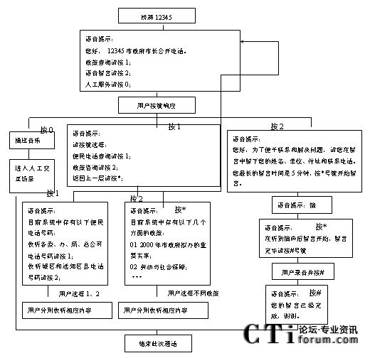CTI論壇(ctiforum)07月10日消息: 12345政府熱線,是一個建立在開放的系統(tǒng)平臺之上,采用全中文、圖形化交互式的操作界面,提供開放的接口,能與其他信息、服務系統(tǒng)連接的系統(tǒng),該系統(tǒng)的設計開發(fā)具有先進性、安全可靠性、可擴充性、易用性、友好性等特點。通過政府12345熱線的工作人員在信息系統(tǒng)的平臺上以7X24小時方式運行工作。在該系統(tǒng)工程的設計上還要充分考慮項目實施后可能發(fā)生的突發(fā)性規(guī)模放大量,為未來的發(fā)展趨勢,預留足夠擴容空間,并考慮到由此可能造成的對系統(tǒng)架構、技術實施方案、資源配置等所進行的相應改動,及如何提供開發(fā)工具去滿足不同時期的需要。