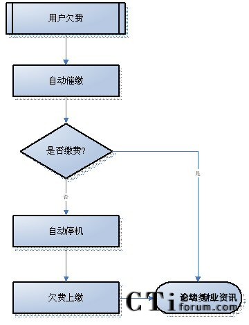- 支持對(duì)后付費(fèi)用戶催繳:該類用戶采用先打電話,按期交費(fèi),超過(guò)規(guī)定期限即視為欠費(fèi),系統(tǒng)開(kāi)始催繳。一旦用戶到營(yíng)業(yè)窗口補(bǔ)交話費(fèi),系統(tǒng)即停止催繳。