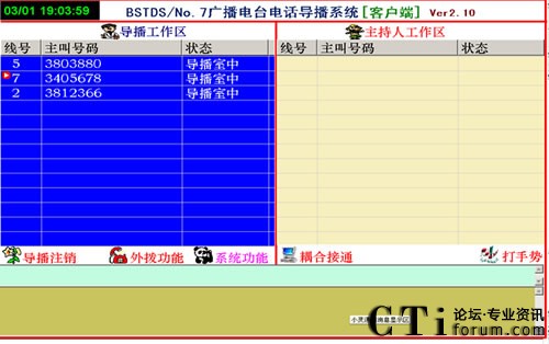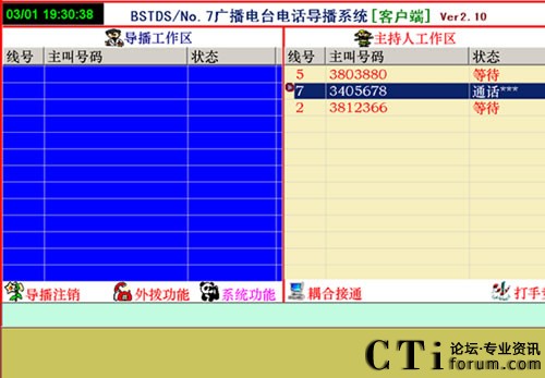 1、直播節(jié)目開(kāi)播時(shí),參與者打進(jìn)電話,由導(dǎo)播把參與電話導(dǎo)入直播區(qū),這時(shí)直播區(qū)顯示參與者的電話號(hào)碼,主持人可以任意的選擇參與者進(jìn)行通話或掛機(jī)。