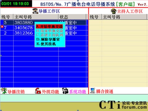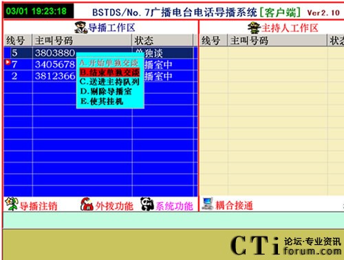 如想接聽(tīng)哪個(gè)電話號(hào)碼,用右鍵點(diǎn)擊這個(gè)號(hào)碼會(huì)出現(xiàn)菜單,在菜單中只有三種命令可以選擇“單獨(dú)交談”“剔除導(dǎo)播室”“使其掛機(jī)”。點(diǎn)擊“開(kāi)始單獨(dú)交談”后拿起電話聽(tīng)筒,這時(shí)導(dǎo)播可以單獨(dú)同參與者通話了,其他參與者聽(tīng)不到交談,只能聽(tīng)到音樂(lè)聲,導(dǎo)播問(wèn)明參與者參與內(nèi)容后須接入直播間的,應(yīng)按“結(jié)束單獨(dú)交談”后點(diǎn)擊“送到主持列隊(duì)”送到主持人區(qū)等待主持人同參與者交談。