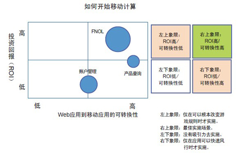 建議考察兩個(gè)基本維度:(1)第一個(gè)移動(dòng)項(xiàng)目的總投資回報(bào)(ROI)和價(jià)值主張是什么?(2)現(xiàn)有的Web應(yīng)用如何通過相對(duì)較少的努力就可以轉(zhuǎn)變成移動(dòng)應(yīng)用?在下面的圖表中這兩個(gè)維度被標(biāo)為X軸和Y軸。氣泡的大小代表投入的大小。很顯然,右上方的象限是容易摘取的果子。您選擇哪個(gè)氣泡關(guān)鍵在于您對(duì)風(fēng)險(xiǎn)的偏好以及在市場中成為領(lǐng)先者的渴望。