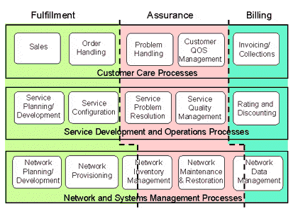 在TMF的模型中,從功能上來看,OSS主要包括三大功能:業(yè)務(wù)開通(Service Fulfillment);業(yè)務(wù)保障(Service Assurance);計費(fèi),又稱業(yè)務(wù)計量(Service