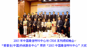 EPSON(中國)客服系統(tǒng)榮獲了"2005中國最佳呼叫中心"大獎。 由信息產(chǎn)業(yè)部中國信息化推進聯(lián)盟客戶關(guān)系管理專業(yè)委員會、CTI論壇客戶關(guān)系管理學院共同舉辦的2005