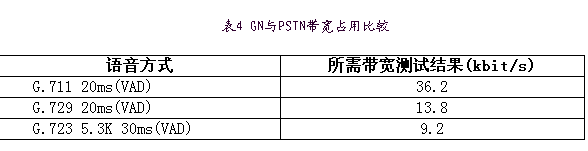 為進一步節(jié)省帶寬,又采用語音激活檢測技術(VAD)及舒適噪音生成(CNG)技術,VAD技術只有當檢測到語音處于活動狀態(tài)時,編碼器的輸出信號才被送到網(wǎng)絡上,因此節(jié)省了帶寬。而在靜音時段采用CNG技術,生成與背景噪聲相匹配的較舒適的靜音,避免了用戶有不自然的交談感覺,保證通話質量。實際測試結果如表4,采用G.72920ms打包+VAD技術節(jié)省了近75%的帶寬。