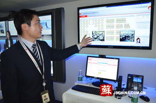 企業(yè)工作人員介紹先進(jìn)的呼叫中心系統(tǒng)。