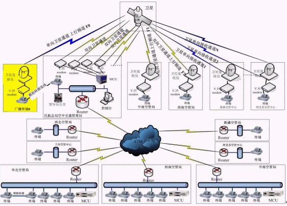 如上圖所示,本系統(tǒng)是一個(gè)由H.323和H.320組成的混合組網(wǎng)的視頻會(huì)議系統(tǒng),總局空管局和華北、華東、東北空管局是通過地面ATM網(wǎng)絡(luò)傳輸,采用的是H.323協(xié)議組網(wǎng),而中南、西南、西北和新疆空管局及其下屬各個(gè)空管中心(站)采用兩種連接方式,一種是一期建設(shè)的ATM網(wǎng)絡(luò),另一種是衛(wèi)星網(wǎng)絡(luò),衛(wèi)星網(wǎng)絡(luò)采用的是H.320協(xié)議組網(wǎng)。其中,在H.320協(xié)議組網(wǎng)的系統(tǒng)中,終端又可分為雙向通訊終端和單向通訊終端,為了節(jié)約衛(wèi)星通道的租用費(fèi)用,其中4條線路采用雙向通訊方式,剩下線路采用單向接收的方式。