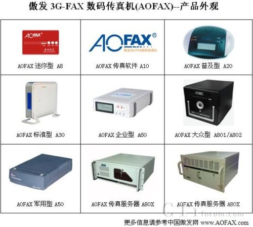 由金恒科技推出的全系列數(shù)碼傳真產(chǎn)品涵蓋了上述三個(gè)種類,上圖就是AOFAX無(wú)紙傳真產(chǎn)品系列的外形圖。其中迷你型A8和傳真軟件A10屬于第一種,普及型A20、標(biāo)準(zhǔn)型A30、軍用型A50和企業(yè)型A60屬于第二種,大眾型A801/A802和專業(yè)型傳真服務(wù)器則屬于第三種。
