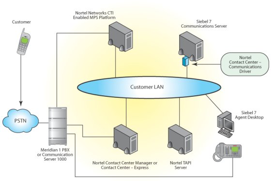 客戶、PSTN、北電網(wǎng)絡支持CTI的MPS平臺、Siebel7通信服務器、北電聯(lián)絡中心通信驅(qū)動器、客戶LAN、Meridian 1