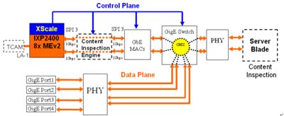Inspection),表頭辨識系針對其流向、連結(jié)、輸入端口及目的地址等做比對;內(nèi)容檢查則有復(fù)雜的算法,處理頻寬及內(nèi)存容量需求極高,很顯然內(nèi)容檢查即將是此系統(tǒng)非常嚴重的交通瓶頸所在,這個運算將耗用大量IXP-2400網(wǎng)絡(luò)處理器的運算資源。因此必須采用另一個處理器卸載此運算,有兩種方法可行,其一是如圖四:加入一顆個可程序內(nèi)容檢查引擎(Programmable