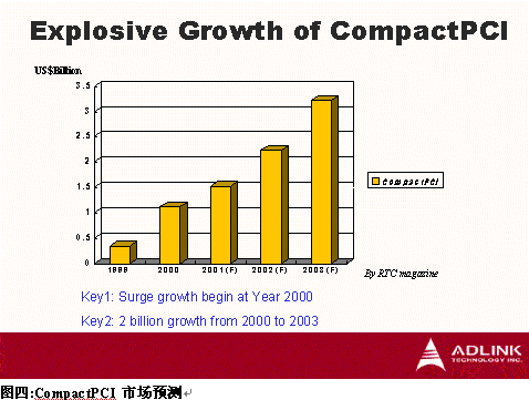 Magazine 估計(jì),CompactPCI市場將由1999年的美金$350 Million成長到2003年的美金$3200 Million,年復(fù)合成長率高達(dá)45.6%,其中又以2002年至2003年最大幅成長。CompactPCI為工業(yè)計(jì)算機(jī)產(chǎn)業(yè)開拓了一個(gè)以往傳統(tǒng)工業(yè)計(jì)算機(jī)無法應(yīng)用的新市場,而CompactPCI需針對電信等級應(yīng)用提供高可靠度及達(dá)到嚴(yán)苛高品質(zhì)要求,卻又為傳統(tǒng)工業(yè)計(jì)算機(jī)廠商豎立高進(jìn)入障礙,因此,目前能提供電信級CompactPCI寬頻通訊平臺幾為國外廠商,如Motorola、Ziatech、Force