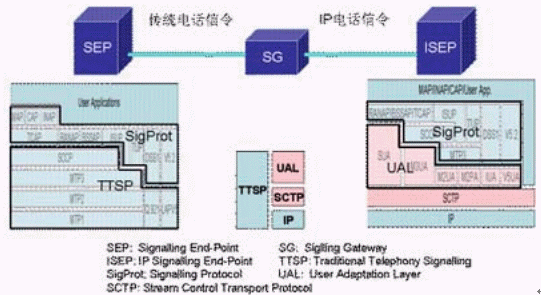 電話網(wǎng)中的一個信令節(jié)點(diǎn)與IP網(wǎng)中的一個信令節(jié)點(diǎn)不能直接相連,它們之間的相互通信需要依靠一個叫做信令網(wǎng)關(guān)(Signalling Gateway,SG)的中間設(shè)備來進(jìn)行。從IP網(wǎng)絡(luò)的角度來看,這個信令網(wǎng)關(guān)有時也叫作應(yīng)用服務(wù)器通信設(shè)備,因為在UAL中常把上述的IP信令節(jié)點(diǎn)叫做應(yīng)用服務(wù)器(Application