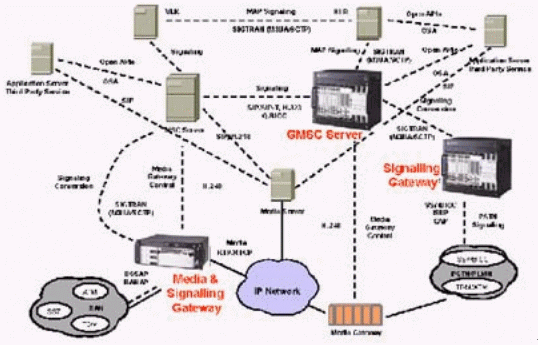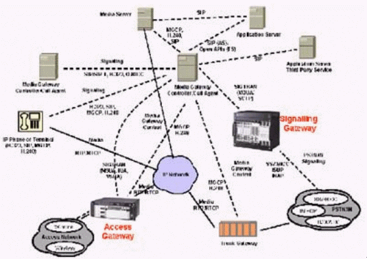 本例中的媒體網(wǎng)關(guān)控制器(MGC)終結(jié)所有的信令,包括直接傳輸?shù)暮屯ㄟ^IP的信令,完成如一個SIP電話向PSTN網(wǎng)絡(luò)發(fā)送信號之類的信令互通,還對打到VoIP網(wǎng)絡(luò)的呼叫進(jìn)行鑒權(quán)和選擇路由,并提供計費(fèi)信息。這個MGC還通過SIP/SIP-T,H.323或Q.BICC與其他的MGC通信。