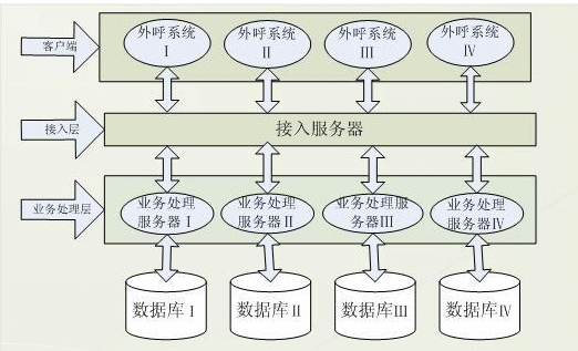 針對舊外呼業(yè)務(wù)系統(tǒng)的弊端及業(yè)務(wù)系統(tǒng)特點(diǎn),賽迪呼叫研發(fā)了基于三層C/S結(jié)構(gòu)的外呼業(yè)務(wù)系統(tǒng),該系統(tǒng)分客戶端,接入服務(wù)器,業(yè)務(wù)服務(wù)器及數(shù)據(jù)庫端?蛻舳税l(fā)送請求給分配服務(wù)器,接受到請求后,分配服務(wù)器根據(jù)客戶端的請求數(shù)據(jù)將其分配給自身的業(yè)務(wù)服務(wù)器做業(yè)務(wù)處理,這樣客戶端與業(yè)務(wù)服務(wù)器建立起聯(lián)系,結(jié)構(gòu)體系如圖: