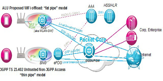 上述方案解決了WiFi分流的認證問題,上海貝爾的方案中,將WLAN的GW功能引入到7750 SR業(yè)務(wù)路由器上,該功能通過7750 SR上的AA-ISA多業(yè)務(wù)板卡實現(xiàn)。WiFi分流為確保安全性,在3GPP TS 23.402中,對WiFi終端的接入,采取了一種所謂瘦管道的模式,即要從用戶端向網(wǎng)關(guān)發(fā)起IP-Sec連接,而AP僅充當橋的作用,對于PC或平板電腦等終端,這不是什么問題,但對于手機而言,IP-Sec將帶來非常大的負荷,不僅影響終端上應(yīng)用的相應(yīng)速度,同時對電池的消耗非常之大,就目前情況看,市場上支持該功能的手機非常少。上海貝爾的方案中,采用了胖管道的模式,通過從AP向網(wǎng)關(guān)建立IP-Sec或GRE隧道,顯著降低了對移動終端的要求,不僅使得移動終端的成本得以下降,同時延長了終端的使用時間,更重要的是,擴大了運營商推廣WiFi 分流方案的適用群體。