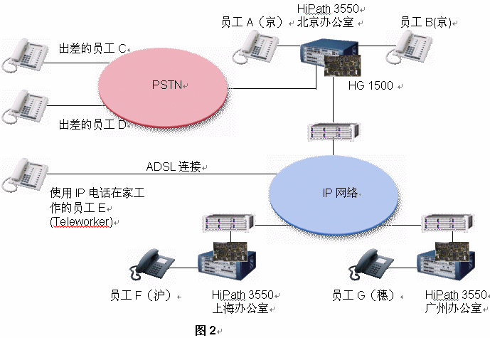 西門(mén)子推薦該公司每一個(gè)辦公室均采用HiPath 3550 PBX。如果,A公司每個(gè)辦公室已經(jīng)擁有DDN專(zhuān)線(xiàn)或ADSL連接至Internet,它就能將其內(nèi)部通信建設(shè)在現(xiàn)存的IP網(wǎng)絡(luò)的基礎(chǔ)之上。其集成網(wǎng)關(guān)HiPath 1500被用來(lái)連接數(shù)據(jù)網(wǎng)絡(luò)和語(yǔ)音網(wǎng)絡(luò)。在這樣的網(wǎng)絡(luò)架構(gòu)中,路由冗余能夠得到充足的保證,因?yàn)槲鏖T(mén)子HiPath解決方案提供了最大的網(wǎng)絡(luò)存活性:即使IP網(wǎng)絡(luò)出現(xiàn)故障,西門(mén)子網(wǎng)絡(luò)設(shè)置能夠?qū)⒙酚勺詣?dòng)切換至PSTN之上。