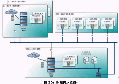 圖 2-5給出了使用純IP實施城市110組網(wǎng)的最普遍的示意。從該圖可以看出,無論采用集中接警還是分散處警,C&CC特別使用于使用純IP技術(shù)實施全市(包括所轄縣級市)110組網(wǎng)。考慮到目前全國公安二、三、四級網(wǎng)建設(shè)日漸成熟,使用純IP技術(shù)實施全市110組網(wǎng)并實現(xiàn)"三警合一"確實是經(jīng)濟、靈活而方便的選擇,前文提到的芬蘭112全國組網(wǎng)使用的也是這樣的技術(shù)。當然,現(xiàn)存的傳統(tǒng)公安通訊專網(wǎng)仍然可以作為備份話務(wù)路由存在。