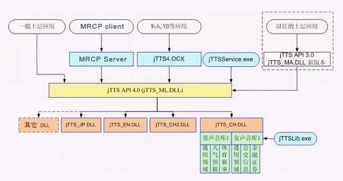 Programming Interface),即jTTS API 4.0,以及統一的多語種引擎管理模塊,即jTTS_ML.DLL。多語種的引擎(例如中文引擎jTTS_CH.DLL,英文引擎jTTS_EN.DLL等)在多語種引擎管理模塊的調度下進行實際的合成工作,而目前尚未提供的其他語種的引擎也可以方便地加入到這個體系結構中來。