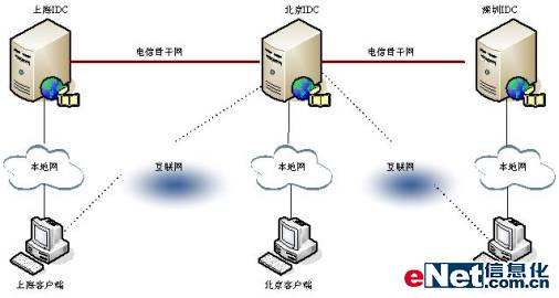 上圖為單服務器和多服務器的部署比較(虛線為單服務器的訪問模式),可以看到,使用多服務器部署后,客戶端可以使用本地網(wǎng)進入系統(tǒng),對于網(wǎng)絡質(zhì)量優(yōu)化有很大的優(yōu)勢。另外,服務器間音視頻流的傳輸將不會出現(xiàn)數(shù)據(jù)冗余現(xiàn)象,對于減少骨干網(wǎng)的壓力也有益處。