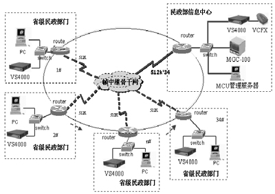 系統(tǒng)骨干網(wǎng)絡(luò)為民政廣域網(wǎng),該網(wǎng)提供512Kbps帶寬(幀中繼)的傳輸信道。整個系統(tǒng)以北京總部為中心,覆蓋全國37個省、自治區(qū)、直轄市以及計劃單列市的民政部門,成為電子政務(wù)標志性工程——“數(shù)字民政”的一個重要組成部分。