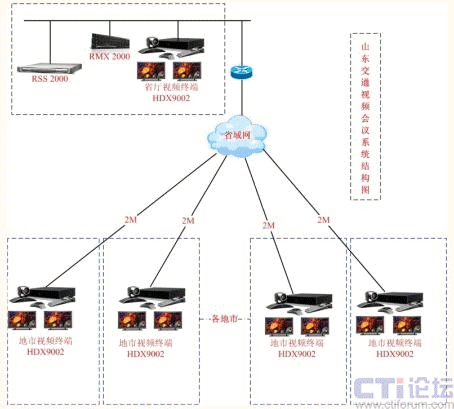 山東省交通廳高清視頻會議系統(tǒng)架構(gòu)在一個完善的、高性能的TCP/IP網(wǎng)絡基礎(chǔ)之上,基于交通廳全新開通的2M專線光纖網(wǎng)絡,以省交通廳為主會場,全省各地市交通局(委)為分會場,共18個會場。