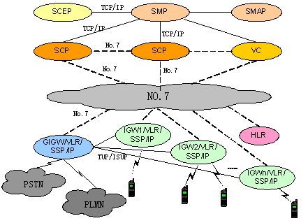 中興PCS智能網可根據用戶需要采用多種靈活的組網方案,既可全省或多地區(qū)集中建設一套平臺,充分節(jié)約投資和快速進行業(yè)務提供,又可按地市單獨建設,充分保證業(yè)務的靈活性。系統支持與其他PCS網絡的良好互通,可同時為其它系統提供PCS智能業(yè)務。中興PCS智能網基于No.7信令與交換網絡連接,不占用話路資源,采用嵌入式組網,智能業(yè)務采用簽約信息觸發(fā),SSP(Service Switch Point)和SCP(Service Control Point)之間采用No.7信令進行通信,在這種組網方式下,不存在話路迂回,有效節(jié)約運營商寶貴的網絡資源,并可以根據簽約信息靈活開展多種智能業(yè)務,智能網信令也能很好地支持用戶的移動性,給用戶提供更靈活、方便和個性化的服務。