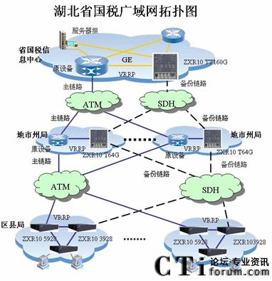 2008年,湖北國(guó)稅再次與中興通訊通力合作,在06年改造的基礎(chǔ)上,將全省原有的108個(gè)區(qū)縣的原三層路由交換機(jī)替換為中興通訊的全千兆三層路由交換機(jī)5928,與備份網(wǎng)的3928之間啟用VRRP協(xié)議,實(shí)現(xiàn)了湖北國(guó)稅核心,匯聚,接入三級(jí)網(wǎng)絡(luò)均無單點(diǎn)故障的改造目標(biāo)。