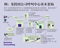 ---- 圖示是一個由德勤咨詢公司為一全球性客戶提出的呼叫中心建議,呼叫中心經(jīng)常需要這樣復雜的一個技術(shù)平臺和基礎(chǔ)支持才可能實現(xiàn)快速的來電和去電處理。