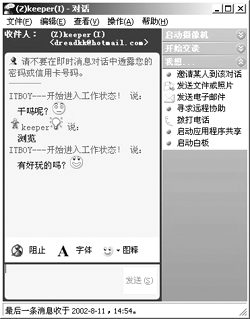 聊天功能是IM軟件最基本、也是最重要的功能,基本上每一種IM軟件在這個功能上的操作都差不多:如果用戶想與聯(lián)系人進(jìn)行聊天,可以雙擊IM中聯(lián)系人的頭像,在彈出的對話框中敲入文字信息發(fā)送即可。QQ的特點(diǎn)是可以給不在線的朋友發(fā)送信息,對方下次上線的時候可以收到,MSN雖然不具備這樣的功能,但是它在聊天過程中可以使用各種漂亮的表情圖標(biāo)為聊天添加了不少情趣。