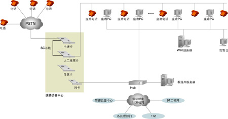 系統(tǒng)的核心是話路語音中心,主要實現(xiàn)兩大功能: 一是實現(xiàn)180系統(tǒng)的話路語音平臺; 二是實現(xiàn)與電話網(wǎng)絡的接口。以1臺Pentium級工控機作為處理平臺,2塊30線數(shù)字中繼語音處理卡,1塊帶振鈴器的24線模擬座席電話轉(zhuǎn)接卡,1塊4路傳真卡,卡間以語音處理行業(yè)的標準總線SC總線相連。系統(tǒng)與電信網(wǎng)絡的接口采用E1數(shù)字中繼線,信令方式采用中國一號信令為隨路信令,工控機用TCP/IP協(xié)議與局域網(wǎng)相連。