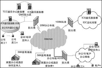 在實際建立的系統(tǒng)中,采用了公司內(nèi)部3臺服務(wù)器。一臺ICC主要用作登錄認(rèn)證及用戶和服務(wù)器管理;2臺ICS服務(wù)器,一臺布置在防火區(qū),供外網(wǎng)用戶的訪問,一臺在內(nèi)網(wǎng),供公司內(nèi)部員工使用。在公司外面,托管了一臺ICS(通訊服務(wù)器),供公司外部用戶訪問。