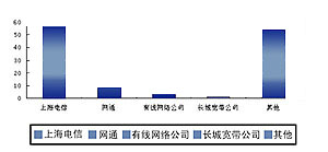 在國內(nèi),視訊市場(chǎng)的形成已經(jīng)初露端倪,眾多商家都開始瞄準(zhǔn)這個(gè)新的利潤(rùn)增長(zhǎng)點(diǎn)。2002年8月,上海電信正式將視訊業(yè)務(wù)命名為“新視通”,并陸續(xù)開通了上海至美國洛杉磯、新疆烏魯木齊、石河子、克拉瑪依等地區(qū)的公眾視訊業(yè)務(wù),同時(shí)還針對(duì)商用客戶和個(gè)人用戶啟動(dòng)了推廣計(jì)劃。由于上海是我國的貿(mào)易、金融、經(jīng)濟(jì)中心,許多國內(nèi)外的大型企業(yè)都在上海設(shè)有分支機(jī)構(gòu),市場(chǎng)潛力不可估量,眾多運(yùn)營商都在爭(zhēng)取上海的市場(chǎng)。目前,除了上海電信推出的“新視通”業(yè)務(wù)外,網(wǎng)通、有線網(wǎng)絡(luò)和其它公司都在上海推出了自己的視訊系統(tǒng)。根據(jù)我們對(duì)企業(yè)用戶的抽樣調(diào)查,下圖的市場(chǎng)占有率表明了視訊業(yè)務(wù)的競(jìng)爭(zhēng)將會(huì)日益激烈。