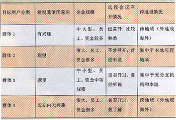 根據(jù)前一階段我們做的視訊業(yè)務(wù)市場(chǎng)研究,目前的主要目標(biāo)客戶可以定位為以下范圍:對(duì)于“新視通”會(huì)議系統(tǒng)感興趣的客戶,需要觀望的客戶以及雖然不感興趣但企業(yè)規(guī)模較大、存在著一定會(huì)議需求卻對(duì)遠(yuǎn)程會(huì)議不了解的客戶。通過對(duì)目標(biāo)群體的進(jìn)一步細(xì)分,我們將客戶聚類為四個(gè)主要群體: