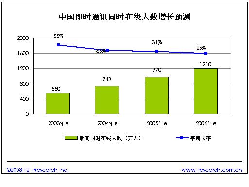 我們預計未來隨著中國上網人口的增長,以及IM軟件的不斷普及,即時通訊在線人數(shù)將保持快速增長。預計2004年國內IM最高同時在線人數(shù)有望突破740萬人,到2006年將突破1200萬人同時在線。