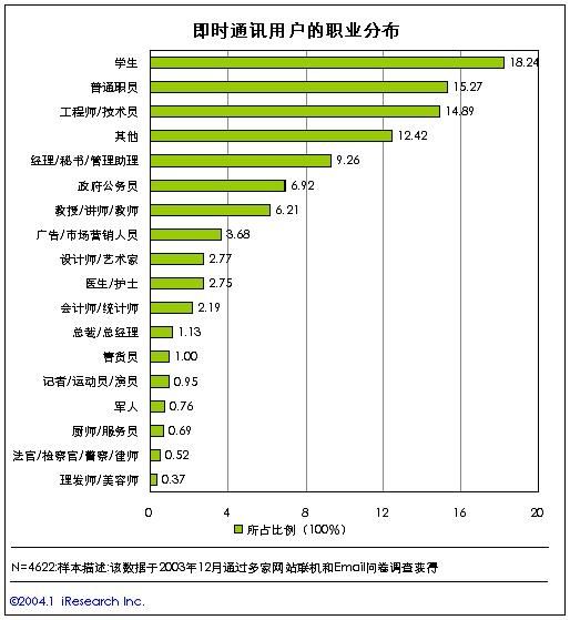 從即時通訊用戶的職業(yè)結構來看,在中國的即時通訊用戶中,學生、普通公司職員、工程技術人員構成了最主要的用戶群體,其中學生的比例最高,達到了18.24%?撮_學生是中國即時通訊的生力軍。