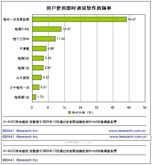 即時通訊所擁有的實時性、跨平臺性、成本低、效率高等諸多優(yōu)勢,使之成為網民們最喜愛的網絡溝通方式之一。從用戶使用即時通訊軟件的頻率來看,是比較高的。根據我們的調研結果,58%的用戶至少每天使用一次即時通訊軟件,使用頻率在每周一次以下的用戶比例僅為15%。