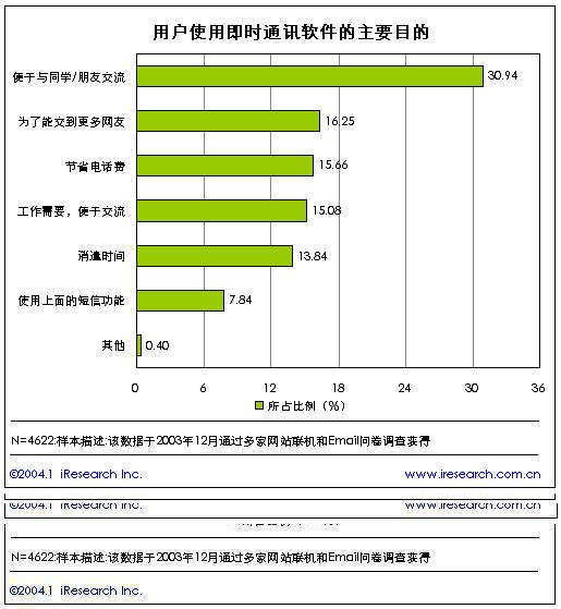 即時通訊作為網民最常使用的應用之一,即時通訊的多功能性可以滿足用戶的不同需求,達到不同的目的,根據艾瑞市場咨詢(iResearch)的研究結果,在問及用戶使用即時通訊的目的時,有31%的用戶選擇了“便于與同學/朋友交流”作為使用即時通訊軟件的最主要的目的,16%的用戶選擇“為了交到更多的朋友”作為作主要的目的,兩者相加的比例接近了50%。說明與朋友、網友間的交流聊天仍然是即時通訊軟件的最主要的功能。同時,即時通訊軟件用戶一般還同時使用包括文件傳送、語音聊天、郵件檢查、群組聊天、手機綁定等其他功能。而文件傳輸是其中最主要的一項功能。